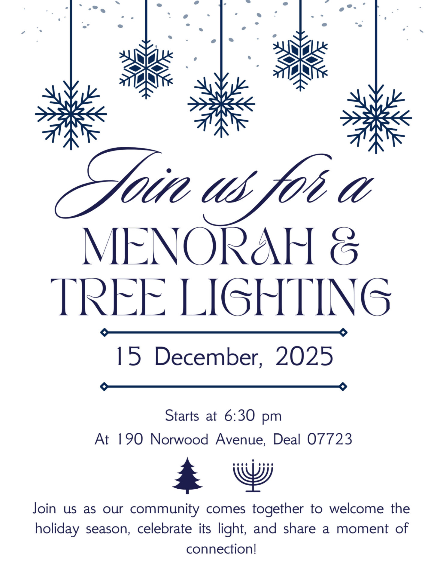 Home Meetings - Borough of Deal General Public Menorah & Tree Lighting Menorah & Tree Lighting + Add to Google Calendar + iCal / Outlook export Date Dec 15, 2025 Meeting concluded Time 6:30 pm - 8:00 pm Category General Public